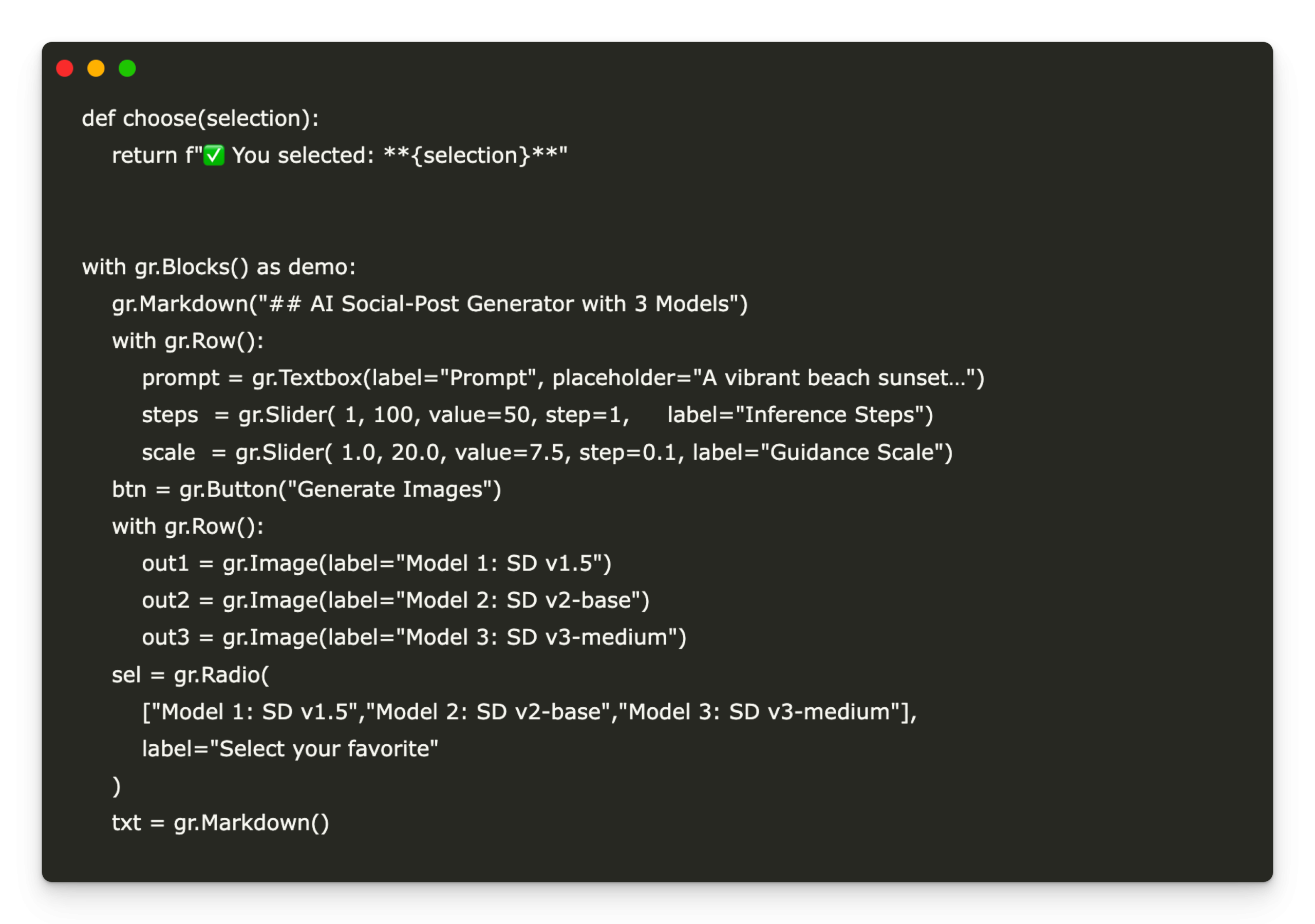 gr.Markdown(“## AI Social-Post Generator with 3 Models”)