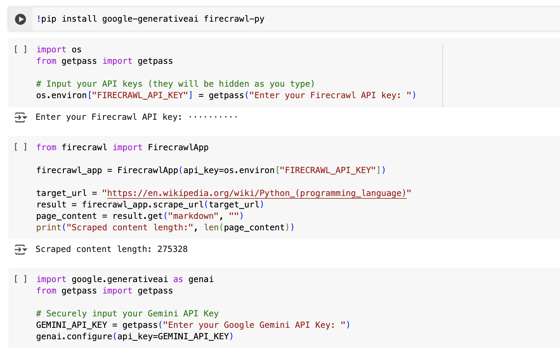 First, we install google-generativeai firecrawl-py, which installs two essential libraries required for this tutorial. google-generativeai provides access to Google’s Gemini API for AI-powered text generation, while firecrawl-py enables web scraping by fetching content from web pages in a structured format.