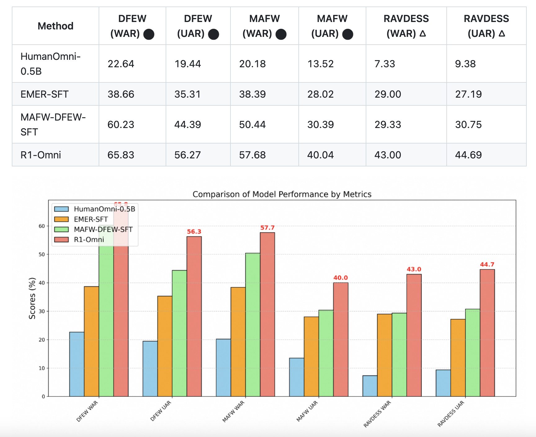 At the core of R1-Omni’s design is the integration of Reinforcement Learning with Verifiable Rewards (RLVR) and Group Relative Policy Optimization (GRPO). RLVR replaces the need for subjective human feedback with a verifiable reward function that assesses the model’s output against objective criteria. The reward system is straightforward: if the model’s emotion prediction matches the ground truth, it receives a reward of 1; otherwise, it receives 0. Additionally, a format reward ensures that the output adheres to a specified structure, where the reasoning process is clearly separated from the final prediction by designated tags.