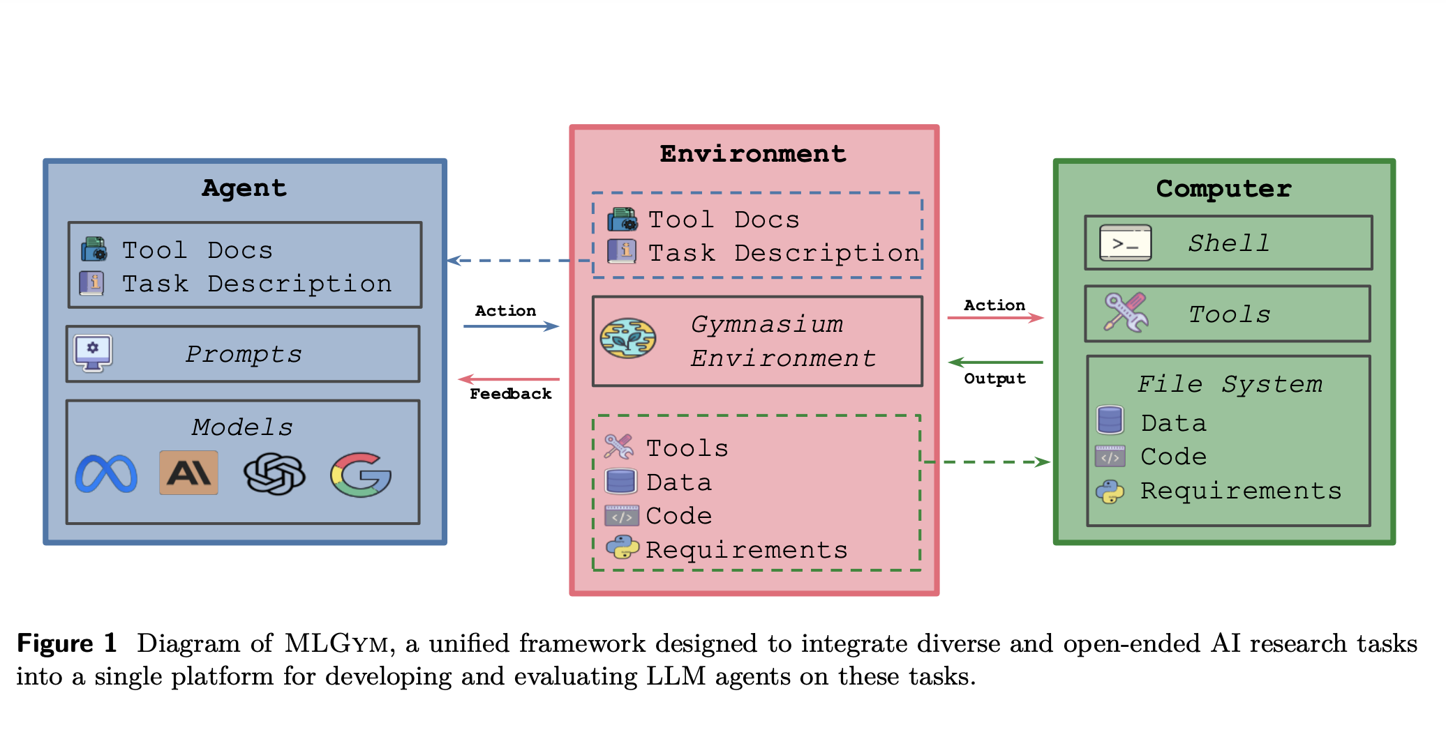 MLGym is a framework designed to evaluate and develop LLM agents for ML research tasks by enabling interaction with a shell environment through sequential commands. It comprises four key components: Agents, Environment, Datasets, and Tasks. Agents execute bash commands, manage history, and integrate external models. The environment provides a secure Docker-based workspace with controlled access. Datasets are defined separately from tasks, allowing reuse across experiments. Tasks include evaluation scripts and configurations for diverse ML challenges. Additionally, MLGym offers tools for literature search, memory storage, and iterative validation, ensuring efficient experimentation and adaptability in long-term AI research workflows.