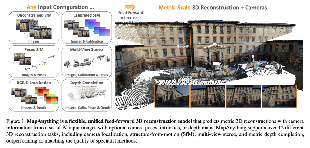A team of researchers from Meta Reality Labs and Carnegie Mellon University has introduced MapAnything, an end-to-end transformer architecture that directly regresses factored metric 3D scene geometry from images and optional sensor inputs. Released under Apache 2.0 with full training and benchmarking code, MapAnything advances beyond specialist pipelines by supporting over 12 distinct 3D vision tasks in a single feed-forward pass.