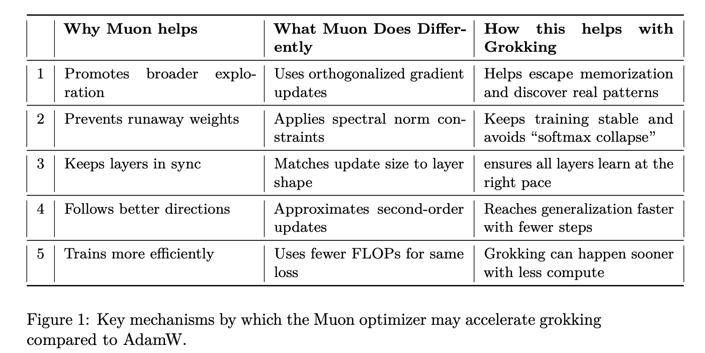The findings provide strong evidence that optimizer geometry significantly influences the emergence of generalization in overparameterized models. By steering the optimization path through second-order-aware updates and spectral norm constraints, Muon appears to facilitate a more direct route toward discovering the underlying data structure, bypassing prolonged overfitting phases.