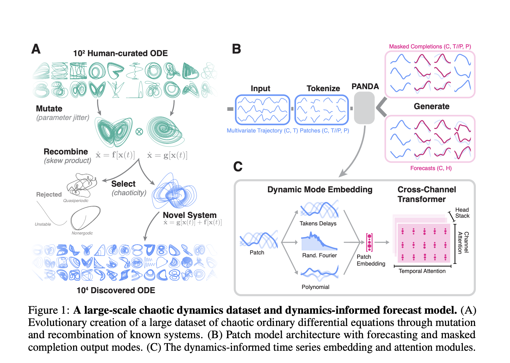 Researchers at the Oden Institute, UT Austin, introduce Panda (Patched Attention for Nonlinear Dynamics), a pretrained model trained solely on synthetic data from 20,000 algorithmically-generated chaotic systems. These systems were created using an evolutionary algorithm based on known chaotic ODEs. Despite training only on low-dimensional ODEs, Panda shows strong zero-shot forecasting on real-world nonlinear systems—including fluid dynamics and electrophysiology—and unexpectedly generalizes to PDEs. The model incorporates innovations like masked pretraining, channel attention, and kernelized patching to capture dynamical structure. A neural scaling law also emerges, linking Panda’s forecasting performance to the diversity of training systems.
